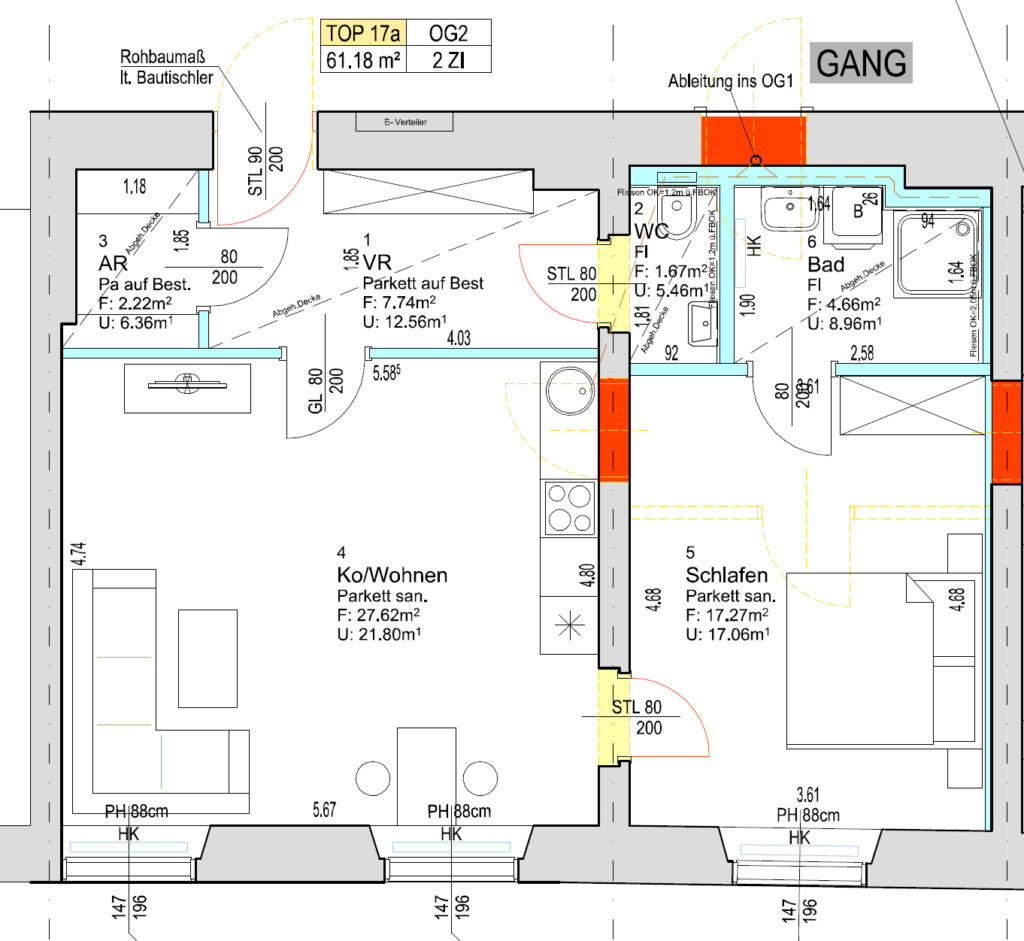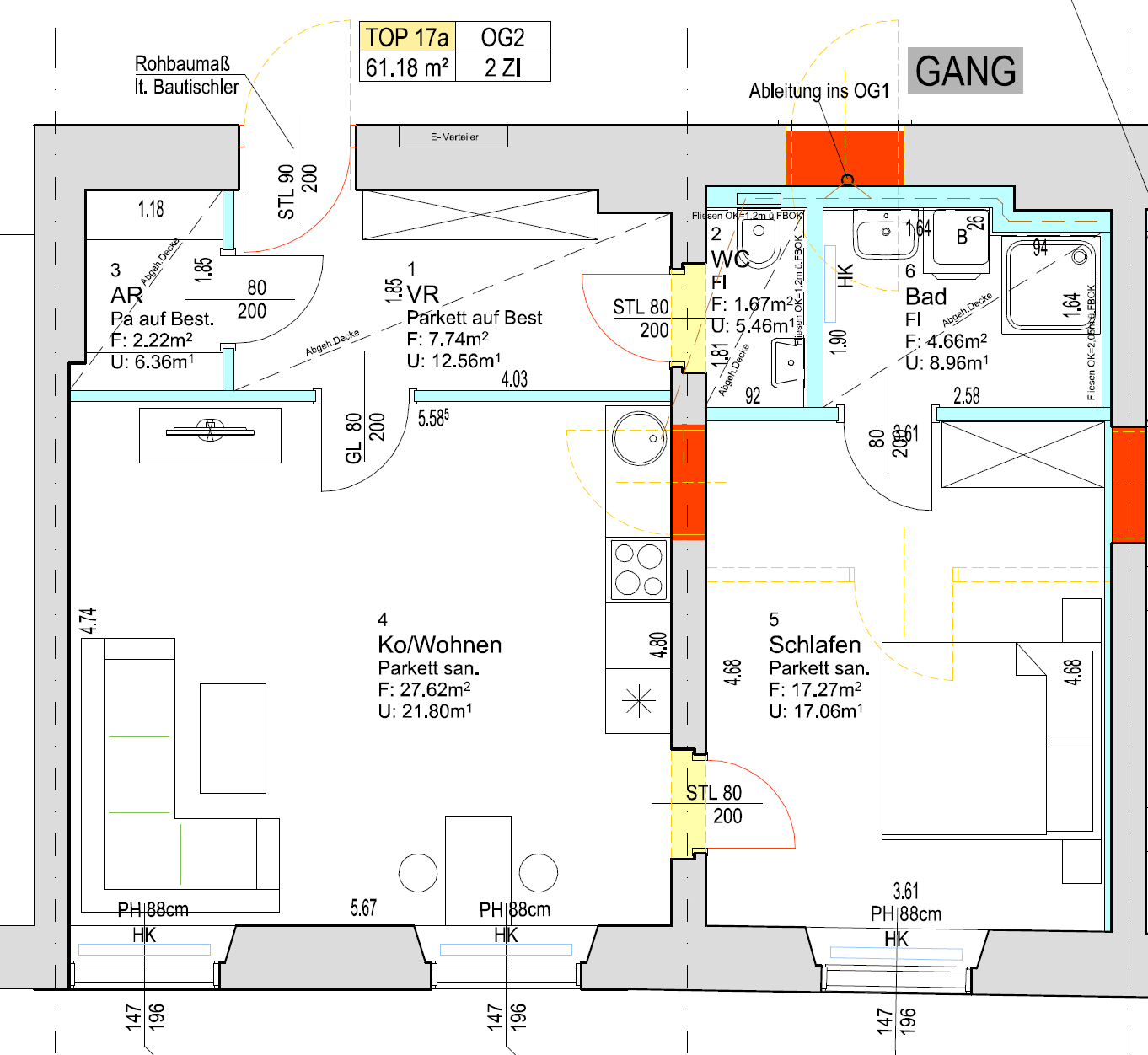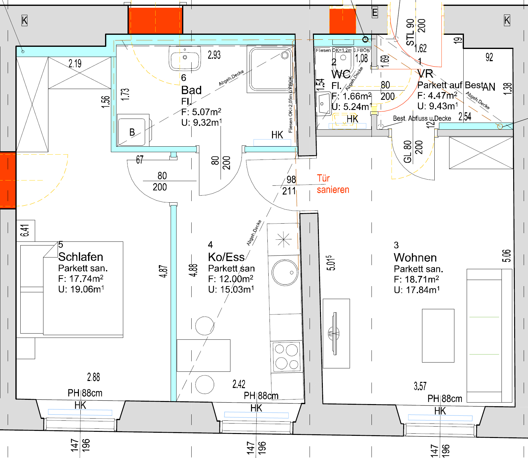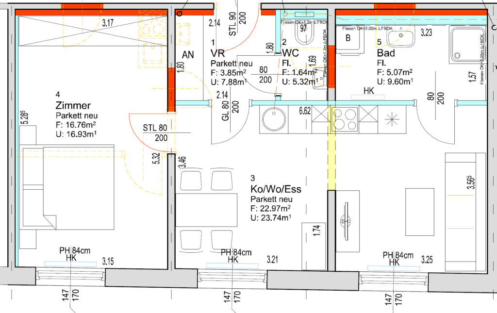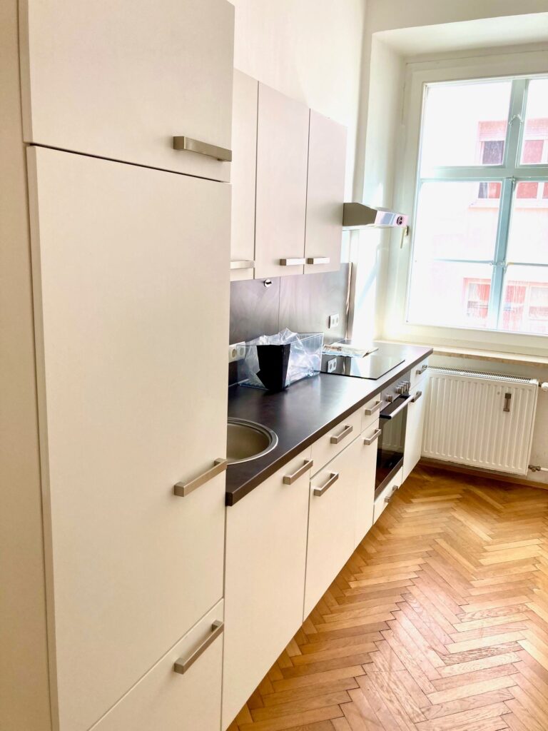 Sonnige 2-Zimmerwohnung mit vollausgestatteter Küche, edlem Firschgrat-Parkett, separatem Abstellraum und Toilette.